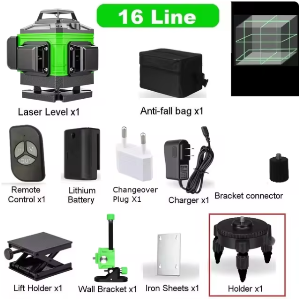 이 레이저 레벨기는 기본 16라인 만을 제공합니다. 충전 배터리 방식을 사용하고 옵션 역시 삼각대부터 리모컨까지 모든 액세서리를 제공합니다.