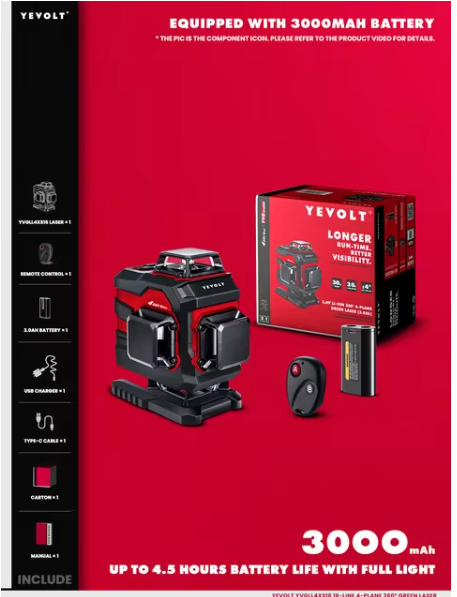 YEVOLT Laser Level Green 12/16-Line 3/4-Plane Self-leveling 360 Horizontal & Vertical Accurate Measuring Tool-YVGLL4XS-Series -